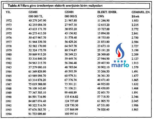 Birim elektrik enerjisi ile GSMH'daki artışı bulabilmek için, GSMH'nın Amerikan Doları cinsinden değeri, o yıl içinde tüketilen elektrik enerjisi değerine bölünmüştür. Elektrik enerjisi açığının olduğu yılları düşündüğümüzde bu değer bize üretilemeyen birim elektrik enerjisinin GSMH'da yapacağı azalmayı; yani üretilemeyen elektrik enerjisinin ülkemiz açısından birim kayıp maliyetini verecektir. Bu değerin yıllara göre değişimi Tablo.4'te verilmiştir (3). Bu Tablodan görüleceği gibi, ülkemiz gibi gelişmekte olan ülkeler açısından, üretilemeyen enerji en pahalı enerjidir. Elektrik Çarpanı olarak adlandırılan bu değerin diğer bir yorum da elektrik enerjisinin verimli kullanımı ile ilgilidir. Bu değer ne kadar büyük olursa, elektrik enerjisi o derece verimli kullanılmaktadır; yani birim enerji kullanımı ile GSMH'ya yapılan katkı o derece artmış olmaktadır.