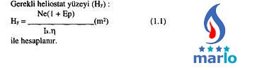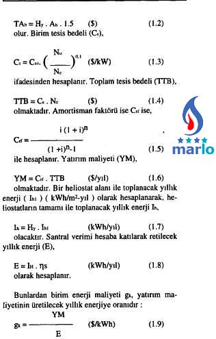 Bu çalışmada, kollektör ışınım şiddeti (Ik) 0.93 kW/m2, santralin emniyet payı (Ep) %15, santral verimi (hS) %25, arsa bedeli (Ab) 15$/m2, baz alınan birim tesis bedeli (Cso) 3500 $/kW, baz alınan efektif güç (No) 1000 kW, faiz oranı (i) %6, amortisman ömrü (n) 10 yıl olarak alınmış ve her bölge için ışınım şiddetleri bulunarak hesaplamalar yapılmıştır (4). Gerekli heliostat yüzeyi (Hy):