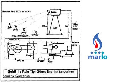 Güneş Kule Santrallarda elektrik enerjisi üretiminde, heliostat adı verilen iki eksen etrafında hareketli parabolik aynalar güneş ışınlarını yaklaşık 200 m. yüksekliğindeki bir kule üzerinde bulunan kazana yönelterek buhar üretmektedir. Şekil, 1'den de görüldüğü gibi, klasik olarak çalışan türbin-generatör grubunda elektrik enerjisi üretimi sağlanır.