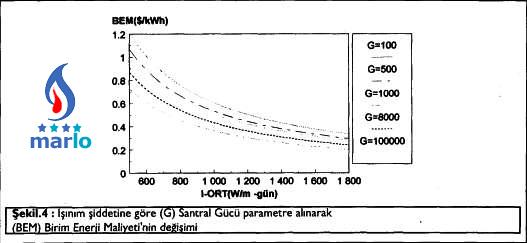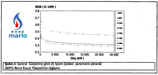 Şekil. 3'de, yukarıda verilen formüllere bağlı şekilde, Türkiye'de bölgelere göre değişen güneş ışınım enerjileri dikkate alınarak, güneş enerjili kule tipi santrallarda güçlere göre birim enerji maliyetlerinin değişimi görülmektedir. Ayrıca, Şekil.4'te de değişen ışınım şiddeti değerlerine göre, birim enerji maliyetleri görülmektedir. Şekil.3 ve Şekil.4'teki eğrileri çizdirmek için, yukarıdaki formüllere dayalı olarak, (I) ışınım şiddeti ve (G) santral gücü parametre alınarak (BEM) Birim Enerji Maliyeti değerlerini hesaplayan bir bilgisayar programı hazırlanmış ve bu program ile elde edilen değerler eğrisel olarak ifade edilmiştir.