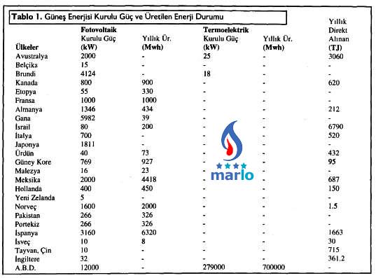 Bu enerji kaynaklan dışında halen bazı uygulama alanlarında kullanılan ve ülkemiz için yaygın bir enerji kaynağı olan "Güneş Enerjisi" hemen göze çarpmaktadır. Ülkemiz için ithal enerji bağımlılığını azaltması, boşa giden enerji kaynağından yararlanma ve çevre faktörü gibi nedenlerle kullanılması uygun olan bir enerji kaynağıdır.