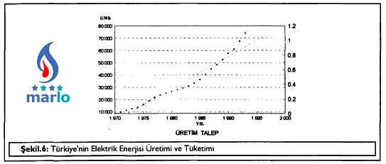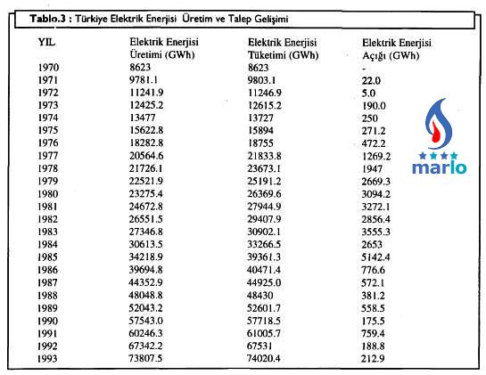 Türkiye'nin yıllara göre elektrik enerjisi üretimi ve tüketimi incelendiğinde 1976 ile 1987 sonuna kadar enerji açığı olduğu görülmektedir. Bu değerler Tablo.3'de sayısal olarak verilmiş ve grafik olarak da Şekil.6'da gösterilmiştir (2).